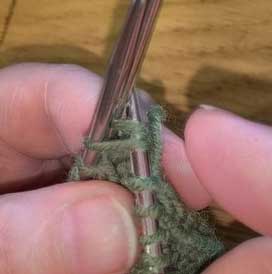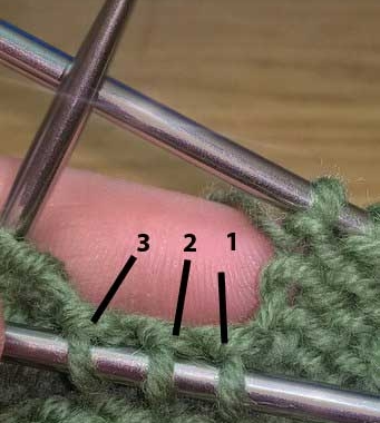 Прибавить 3 петли : снять 3 петли на доп. спицу и оставить за работой, из протяжек нижнего ряда этих петель вывязать 3 новые петли, затем петли с доп. спицы провязать лицевыми.